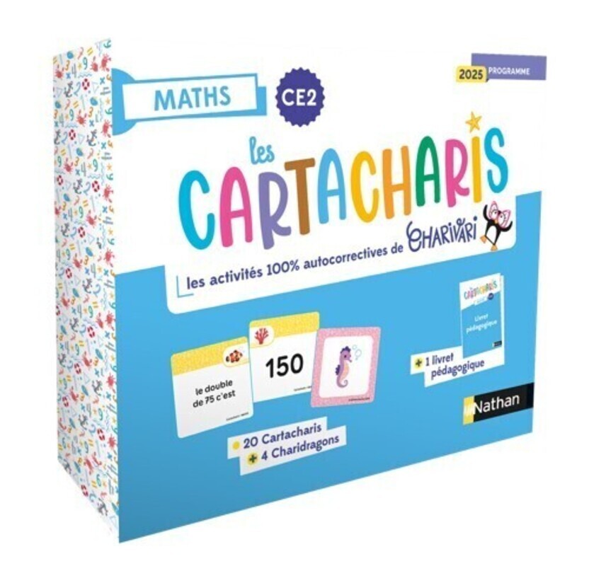 Les jeux de cartes de Charivari, 100% autocorrectifs, pour amener les élèves de CE1 à progresser en maths ! Des activités autocorrectives en Maths, créées par l'autrice-blogueuse Charivari et approuvées par les enseignants : le système permet à l'élève de vérifier sa réponse immédiatement ! Des règles très faciles à comprendre. Du matériel rapide à installer et à ranger. Pour réviser seul ou à plusieurs, 3 modes de travail : solo, duo et collaboratif. Contenu de la boite : // Les jeux de cartes Les 24 jeux de cartes sont classés dans une boite pratique à ranger et à manipuler. Il y a 20 jeux Cartacharis et 4 jeux Charidragons. Chaque couleur correspond à un jeu différent. Il y a des cartes ours et des cartes miel qu'il faut associer. // Le livret pédagogique Le livret se trouve dans la boite. Il va vous permettre de découvrir les différents modes et règles pour vous les approprier facilement. Charivari vous propose une programmation. // Les fiches de suivi Il existe deux fiches de suivi, l'une permet de suivre la progression des jeux Cartacharis et l'autre, celle des jeux Charidragons. Ce sont des outils pratiques, à la fois, pour vous et vos élèves. // Les plateaux de jeux Deux posters peuvent servir de plateaux de jeux. Comment ça marche ? La recherche : L'élève reconstitue des paires de carte en associant une carte "question" à une carte "réponse". L'autocorrection: pour valider qu'une paire est juste, l'élève retourne les cartes: s'il trouve le même dessin, c'est gagné ! BUT DU JEU : reconstituer le plus de paires possibles !
