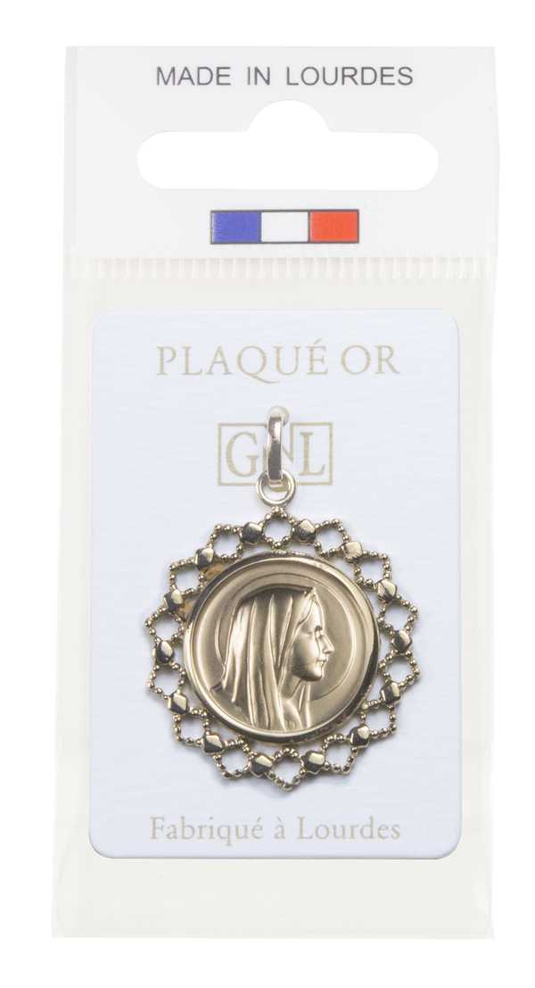Médaille ronde entourage dentelle, vierge de profil. Apparition grotte de Lourdes au verso Taille de la médaille : 26 mm, poids 4.3 gr Plaqué or fin 24 carats, 3 microns minimum, polie miroir et sablage main Base laiton Livrée sous blister Made in Lourdes et carton NGL