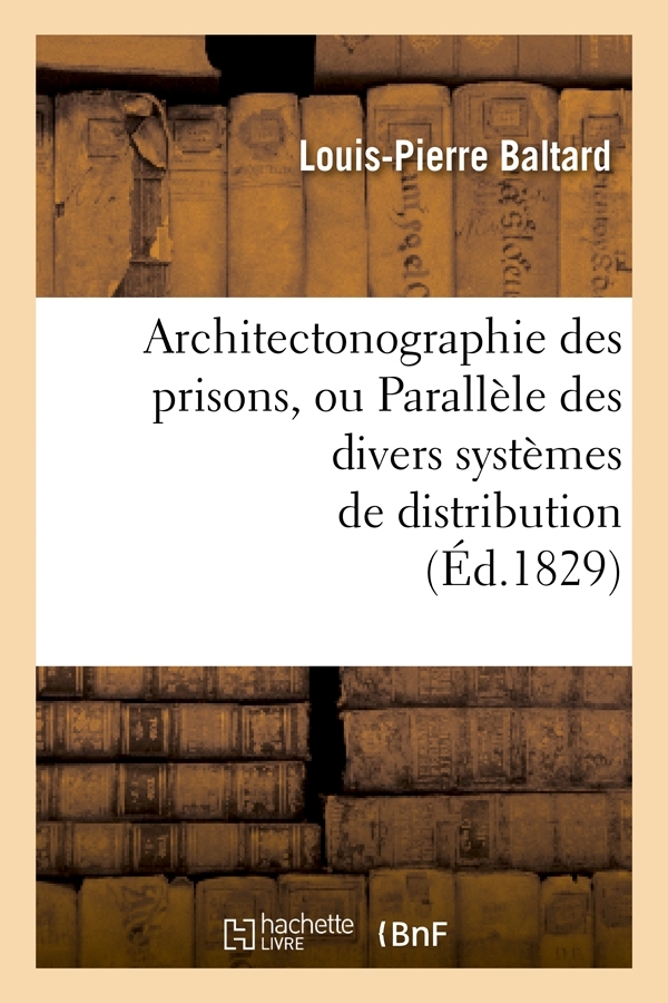 Architectonographie des prisons, ou Parallèle des divers systèmes de distribution dont les prisons sont susceptibles, selon le nombre et la nature de leur population, l'étendue et la forme des terrains / par Baltard,...Date de l'édition originale : 1829Sujet de l'ouvrage : Prisons -- Conception et constructionLe présent ouvrage s'inscrit dans une politique de conservation patrimoniale des ouvrages de la littérature Française mise en place avec la BNF.HACHETTE LIVRE et la BNF proposent ainsi un catalogue de titres indisponibles, la BNF ayant numérisé ces œuvres et HACHETTE LIVRE les imprimant à la demande.Certains de ces ouvrages reflètent des courants de pensée caractéristiques de leur époque, mais qui seraient aujourd'hui jugés condamnables.Ils n'en appartiennent pas moins à l'histoire des idées en France et sont susceptibles de présenter un intérêt scientifique ou historique.Le sens de notre démarche éditoriale consiste ainsi à permettre l'accès à ces œuvres sans pour autant que nous en cautionnions en aucune façon le contenu.Pour plus d'informations, rendez-vous sur www.hachettebnf.fr