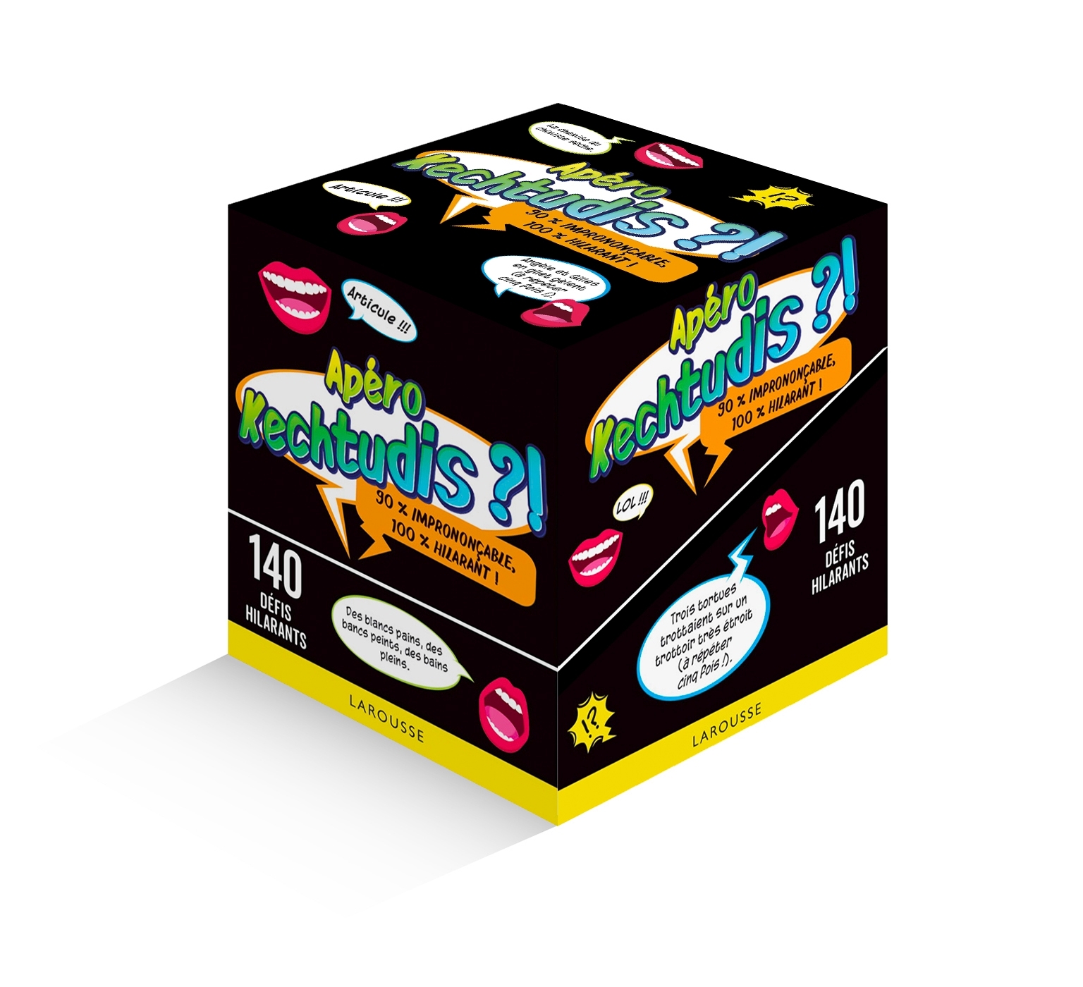 Des défis imprononçables, mais une seule règle : interdit de fourcher !Tournez sept fois votre langue dans la bouche et lisez un maximum de ces cartes casse-tête en un minimum de temps : virelangues, énumérations illogiques, phrases à l’envers… Top chrono : piochez, lisez, répétez, enchaînez... Plus la soirée dure, plus vous entendrez « Kechtudis ?! »