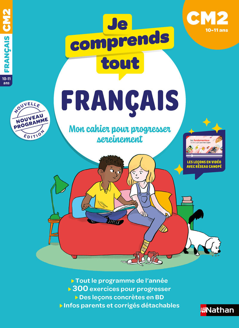 Aidez votre enfant à réussir son année de CM2 grâce à un cahier complet, motivant et conforme au programme , avec 300 exercices, leçons en BD, vidéos et corrigés détachables. Ce cahier Je comprends tout – Français CM2 accompagne votre enfant tout au long de l'année pour maîtriser les notions essentielles : grammaire, conjugaison, orthographe, vocabulaire et production d'écrit. > Une méthode motivante qui donne envie d'apprendre - 300 exercices progressifs pour s'entraîner efficacement. - Leçons claires en BD , idéales pour comprendre les notions abstraites. - Vidéos pédagogiques issues du Réseau Canopé accessibles via QR codes. - Mémos visuels avec l'essentiel à retenir. - Corrigés détachables au centre du cahier pour un travail en autonomie. > Des bénéfices concrets pour votre enfant - Renforcer les bases en français avant l'entrée en 6e. - Travailler à son rythme grâce à des activités variées. - Gagner en confiance en dictée et production écrite. - Comprendre durablement grâce aux explications illustrées.