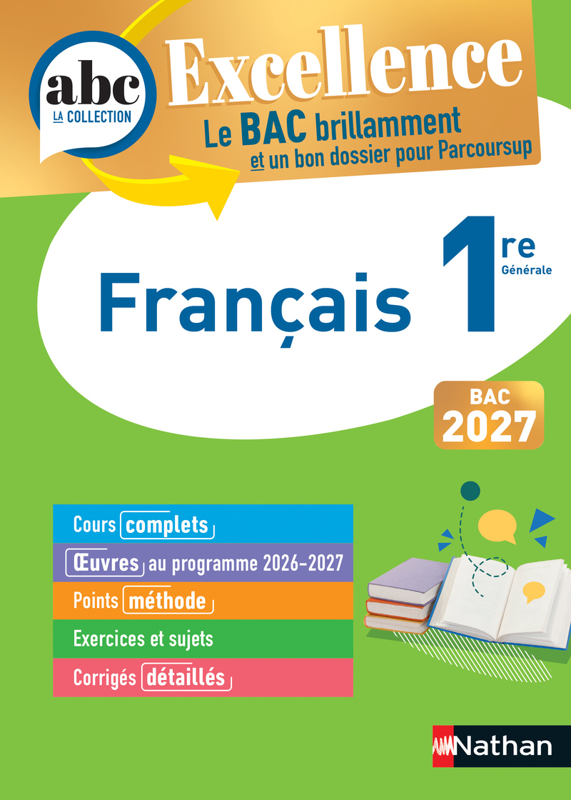 Des cours complets, de l'approfondissement sur toutes les oeuvres au programme 2026-2027, des points méthode, des exercices minutés, des sujets du Bac et des corrigés détaillés pour réviser le français en 1re ! ABC Excellence - Français 1re - Bac 2027 Pour briller à l'épreuve finale ! - Approfondissez toutes les notions du programme : oeuvres intégrales, parcours associés et étude de la langue. - Renforcez vos connaissances à l'aide des rubriques : L 'astuce du prof, Méthode, Vocabulaire, Gagnez des points ... - Mémorisez l'essentiel grâce aux pages Repères (notions-clés, citations-clés, histoire littéraire) et Auteurs-clés . - Entraînez-vous intensivement à l'aide de sujets type bac et de leurs corrigés commentés. - Préparez-vous aux épreuves du bac 2027 (écrit et oral)