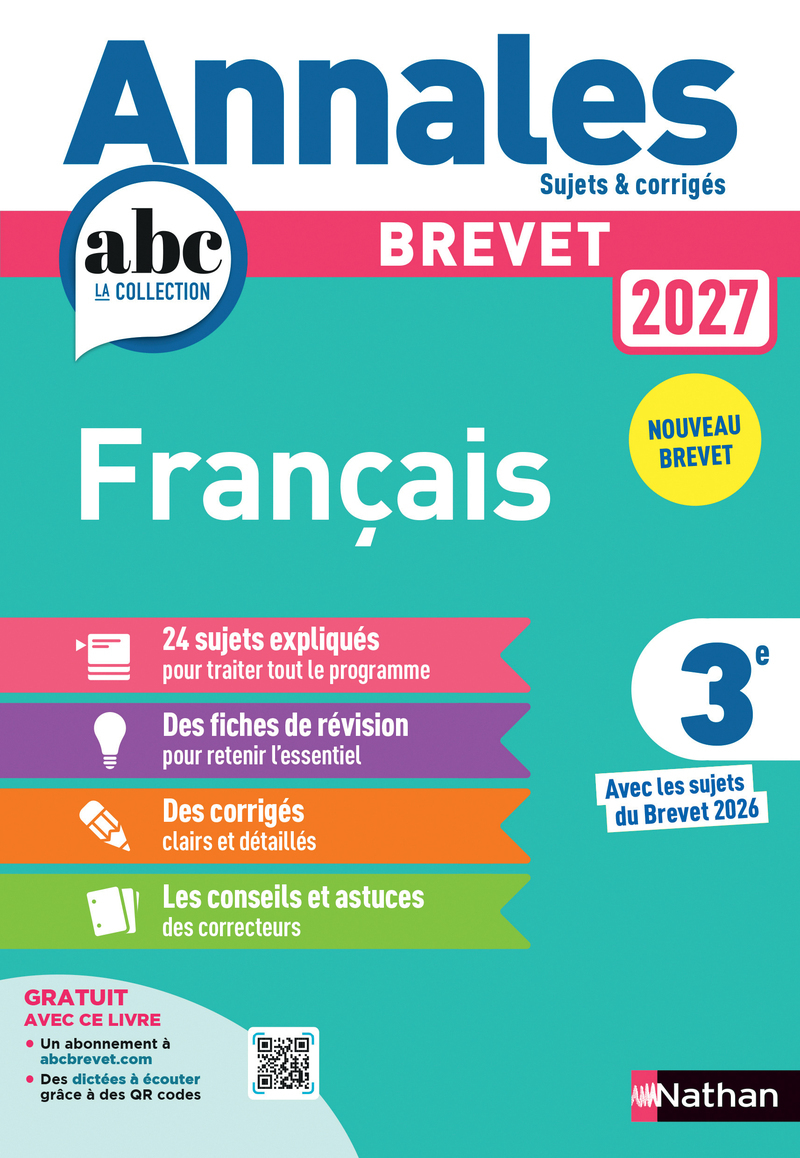 Les Annales ABC du Brevet pour préparer l'épreuve de Français du Brevet 2027Sujets et corrigés - 24 sujets expliqués pour traiter tout le programme du Brevet - Des corrigés clairs et détaillés - Des fiches de révisions pour retenir l'essentiel - Les conseils et astuces des correcteurs Annales ABC du Brevet 2027 Français - Corrigé Conforme aux programmes du Brevet Des sujets pour préparer le Brevet 2027 • Les sujets complets de l'épreuve écrite du Brevet 2026 pour s'entraîner dans les conditions de l'examen. • Des sujets classés par thèmes pour réviser tout le programme. • Un minutage pour se mettre dans les conditions de l'épreuve. • Tous les corrigés détaillés avec des rubriques d'aide . La méthode gagnante pour préparer l'épreuve • L'épreuve expliquée et les critères d'évaluation. • Les conseils pratiques des correcteurs. La synthèse des cours • Des fiches de révisions pour retenir les points-clés . • Des fiches méthode , un lexique , un i ndex des auteurs . +++ des sujets pour s'entrainer à l'épreuve orale