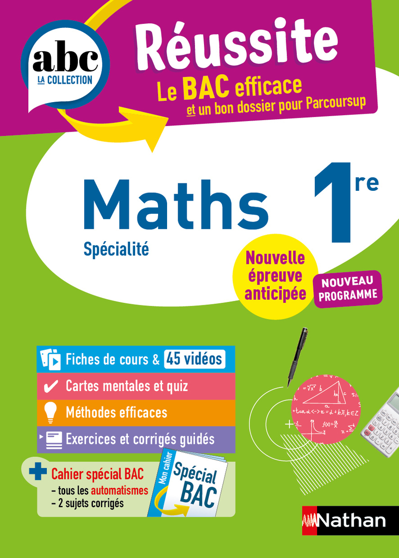 Des fiches de cours , 45 vidéos , des cartes mentales et quiz , des méthodes efficaces , des exercices et corrigés guidés + un cahier spécial Bac pour réviser les mathématiques en 1re ! - Enseignement de spécialité - Conforme à la réforme du Lycée ABC Réussite - Maths 1re - Bac 2027 Le BAC efficace et un bon dossier pour Parcoursup - Des fiches de cours pour réviser tout le programme. - Des pages révisions express avec des cartes mentales pour retenir en un coup d'oeil. - Des quiz pour se tester, des exercices et des sujets de bac avec leurs corrigés guidés pour s'entraîner. - Des méthodes efficaces pour acquérir les bons réflexes. - Des rubriques d'aide : Gagnez des points , L'astuce du prof ... + 45 vidéos pour réviser autrement + Un cahier spécial BAC : description de l'épreuve, sujets corrigés