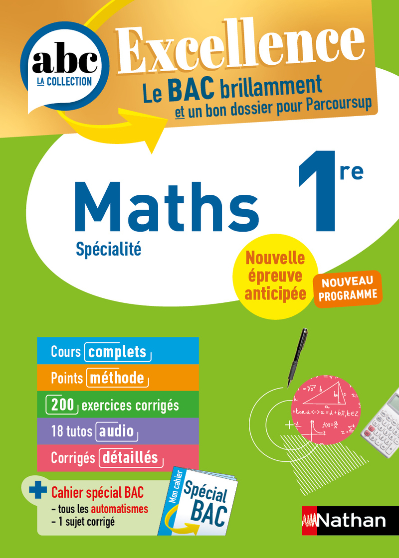 Des cours complets , de l' approfondissement , des points méthode , 200 exercices et sujets, 18 tutos audio et des corrigés détaillés pour réviser les mathématiques en 1re ! Conforme à la réforme du Lycée ABC Excellence - Maths 1re Pour briller toute l'année et assurer un bon dossier Parcoursup - Approfondissez toutes les notions du nouveau programme . - Renforcez vos connaissances à l'aide de rubriques : Rappel , Remarque , Astuce , Méthode ... - Entraînez-vous intensivement à l'aide de plus de 200 exercices variés de difficulté croissante et des sujets corrigés commentés . - Anticipez : de nombreuses rubriques et activités pour vous préparer à l'année de Terminale. + 18 tutos audio pour réviser autrement !