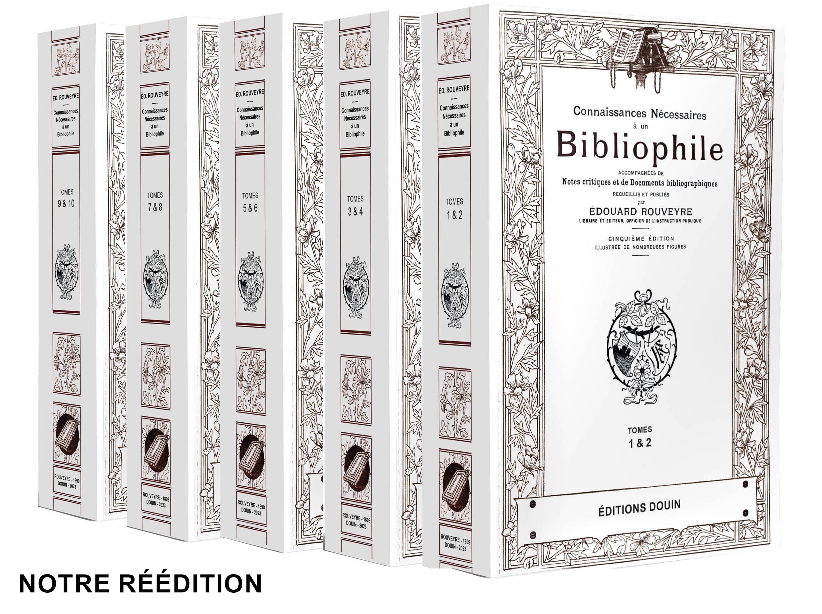 Le titre complet : Connaissances Nécessaires à un Bibliophile accompagnées de Notes critiques et de Documents bibliographiques recueillis et publiés par Edouard Rouveyre. 5e édition illustrée de nombreuses gravures. 10 volumes pour original - 1899.Première réédition de cette fabuleuse documentation pour tout amateur et collectionneur de livres ou, simplement, pour tous ceux qui souhaitent connaitre ce monde fabuleux des livres.Notre édition : 5 volumes dos collés de format 135x215 mm, pagination : 434-482-452-410-376