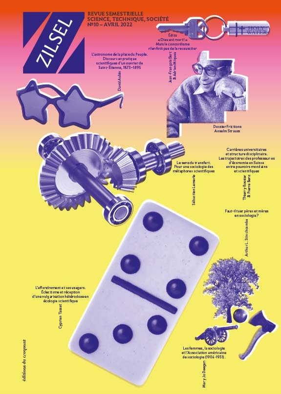 Astronomie populaire au 19e siècle, expertise techno-bureaucratique sur les polluants de l’air, enseignement de l’économie en Suisse, place et fonction de la métaphore scientifique, genèse et réception de la collapsologie : le sommaire assume, comme à chaque fois, un éclectisme de bon aloi en même temps qu’une exigence de rendre raison de développements scientifique dans la société. Dans le même esprit, un dossier est construit sur la base d’une importance conférence – traduite et éditée – du sociologue Anselm Strauss donnée en Suisse en 1975. C’est un bon prétexte pour expliciter les lignes de force d’une approche de l’enquête en sciences sociales qui a particulièrement essaimé en études sociales des sciences. Zilsel est également ravi d’intégrer un entretien au long cours avec l’historienne des sciences Ilana Löwy, dont les apports nombreux sont situés au gré des étapes d’une carrière marquée par des recherches pionnières et des influences durables.
