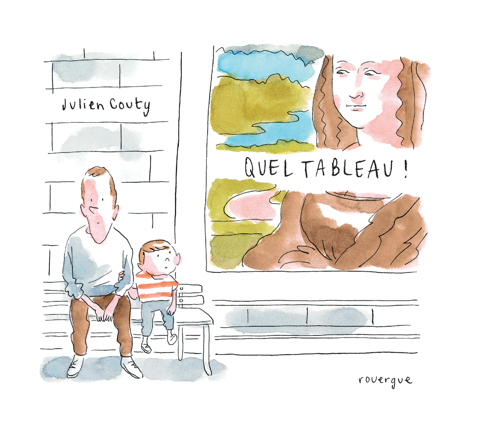 Un enfant et son père visitent un musée. Tout au long de leur parcours, l'étonnement est total : les oeuvres ont été dénaturées, polluées par les artifices du monde moderne dans tous ses dérèglements : climatiques, sociaux, politiques, sanitaires... Trop de plastique dans ce Monet, trop de pesticides dans ce tableau de Millet, animaux absents dans ce Douanier Rousseau, trop d'eau dans ce Gauguin, etc. Julien Couty dresse un tableau impertinent et drôle de notre monde en pastichant les oeuvres majeures de l'art contemporain.