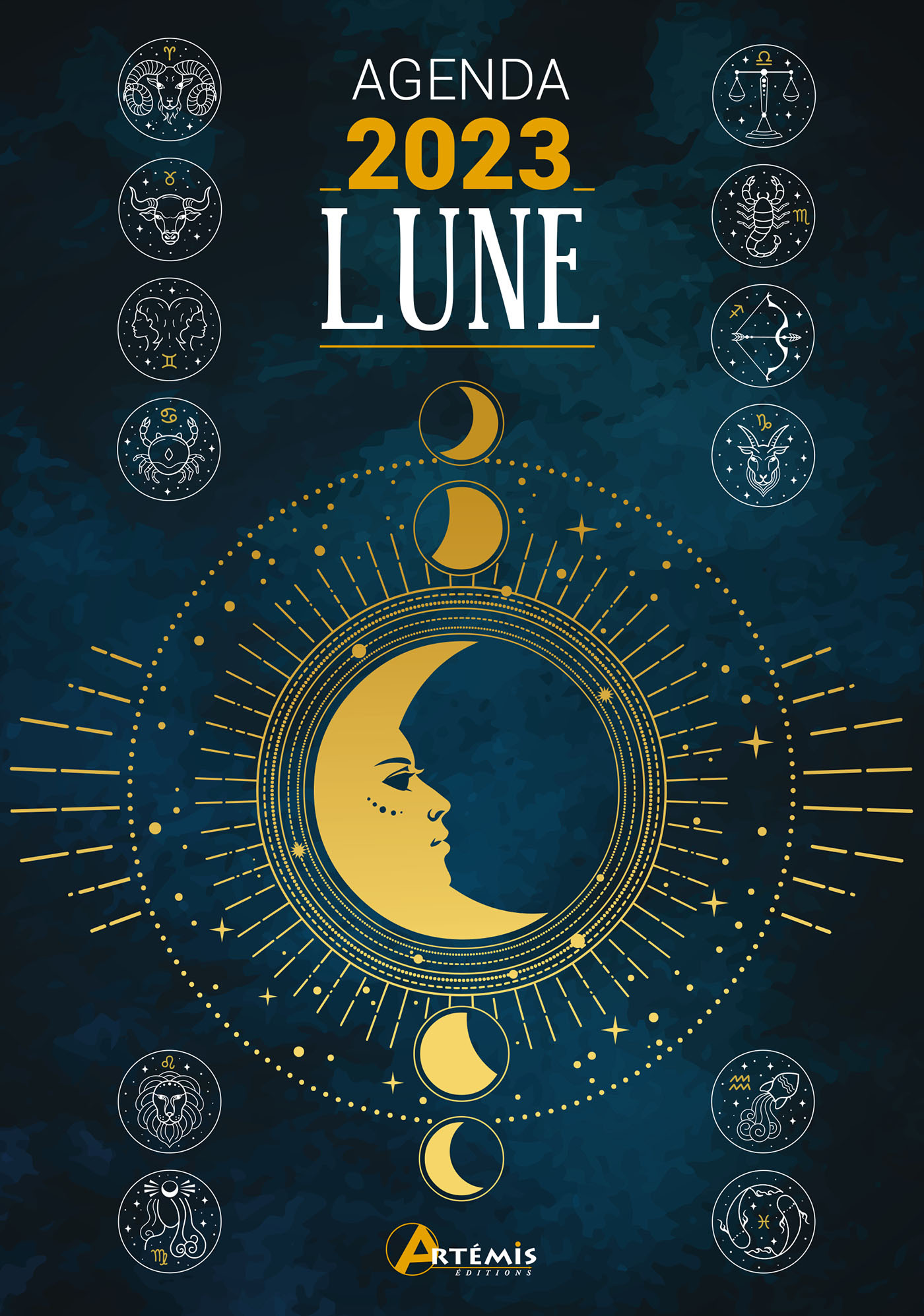 Agenda sur 12 mois, de janvier à décembre 2023, avec toutes les informations lunaires (lune croissante-décroissante, montante-descendante, constellations du zodiaque).Une semaine par double-page, un espace pour chaque jour de la semaine pour noter le... See full description