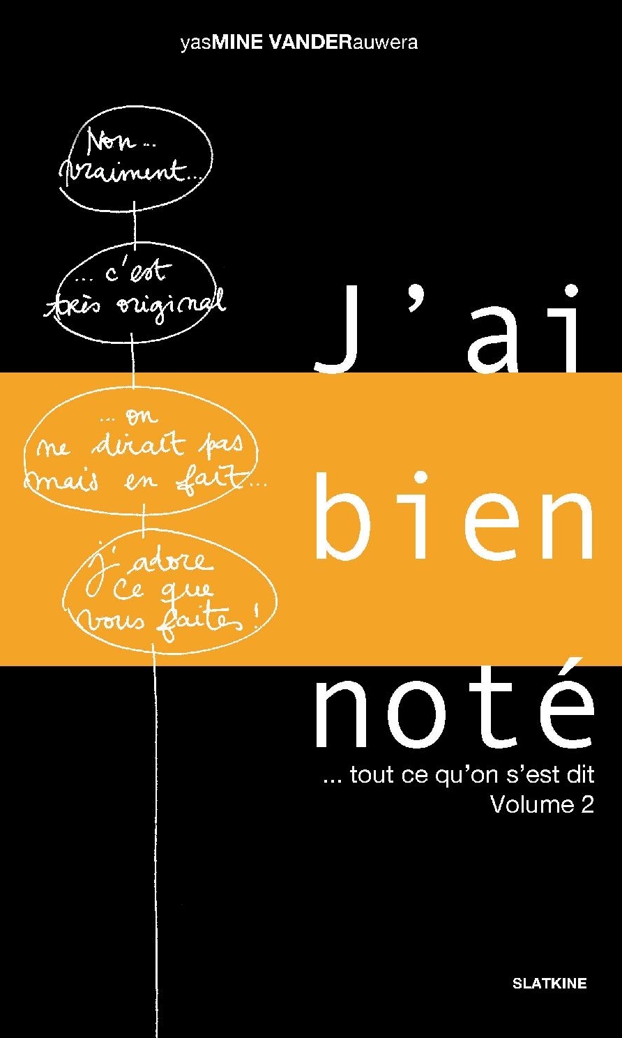 Depuis J'ai bien noté tout ce qu'on s'est dit (volume 1), vous et moi avons parlé de tout et de n'importe quoi surtout n'importe quoi!96 pages de sketchs inspirés des carnets de notes de yasMINE VANDERauwera.