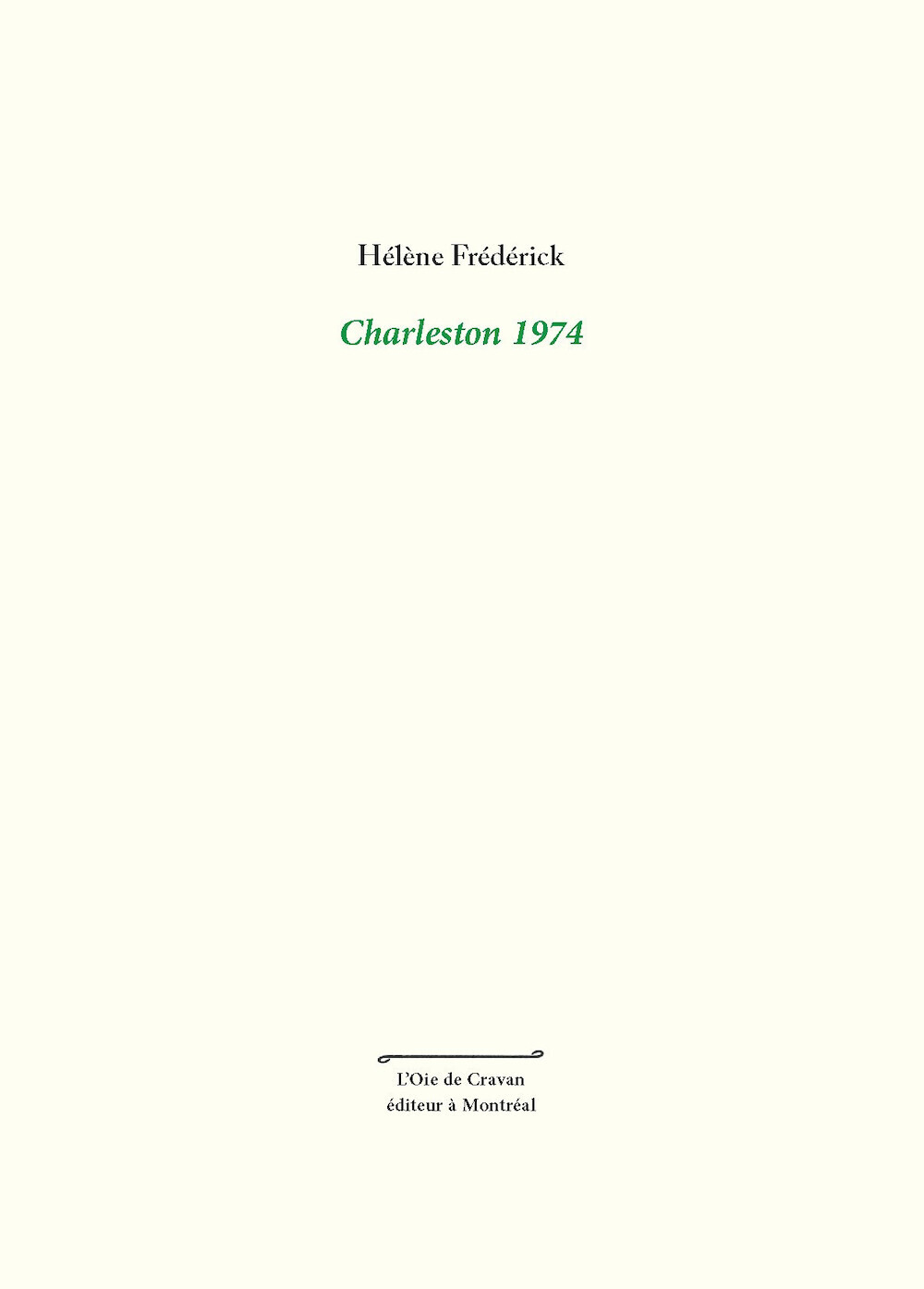 Avant d’être le titre de ce recueil, Charleston 1974 est le titre d’une magnifique photographie de l’américain John McWilliams. C’est une image qui a longuement hanté Hélène Frédérick jusqu’à faire naître cette série de poèmes troublants qui ouvrent sur tout un monde d’échos, qui va de l’enfance de l’autrice à notre propre regard fasciné par le mystère immortalisé par cette image.« Sur le terrain de balle molle, personne. Installées devant rien, dans les gradins, le monde d’en bas aimantait nos jambes ouvertes. Les noyaux de cerise crachés le plus loin possible, je les vois dans Charleston. » Il arrive qu’une image nous transporte dans un monde qu’on croyait oublié. Lieu de métamorphose, le corps du passé devient paysage à déchiffrer, à condition de se pencher sur lui longuement. On peut lui tendre les yeux comme on tend une oreille à l’écoute d’un secret : il se met alors à parler.« Sur le terrain de balle molle, personne. Installées devant rien, dans les gradins, le monde d’en bas aimantait nos jambes ouvertes. Les noyaux de cerise crachés le plus loin possible, je les vois dans Charleston. » Il arrive qu’une image nous transporte dans un monde qu’on croyait oublié. Lieu de métamorphose, le corps du passé devient paysage à déchiffrer, à condition de se pencher sur lui longuement. On peut lui tendre les yeux comme on tend une oreille à l’écoute d’un secret : il se met alors à parler.