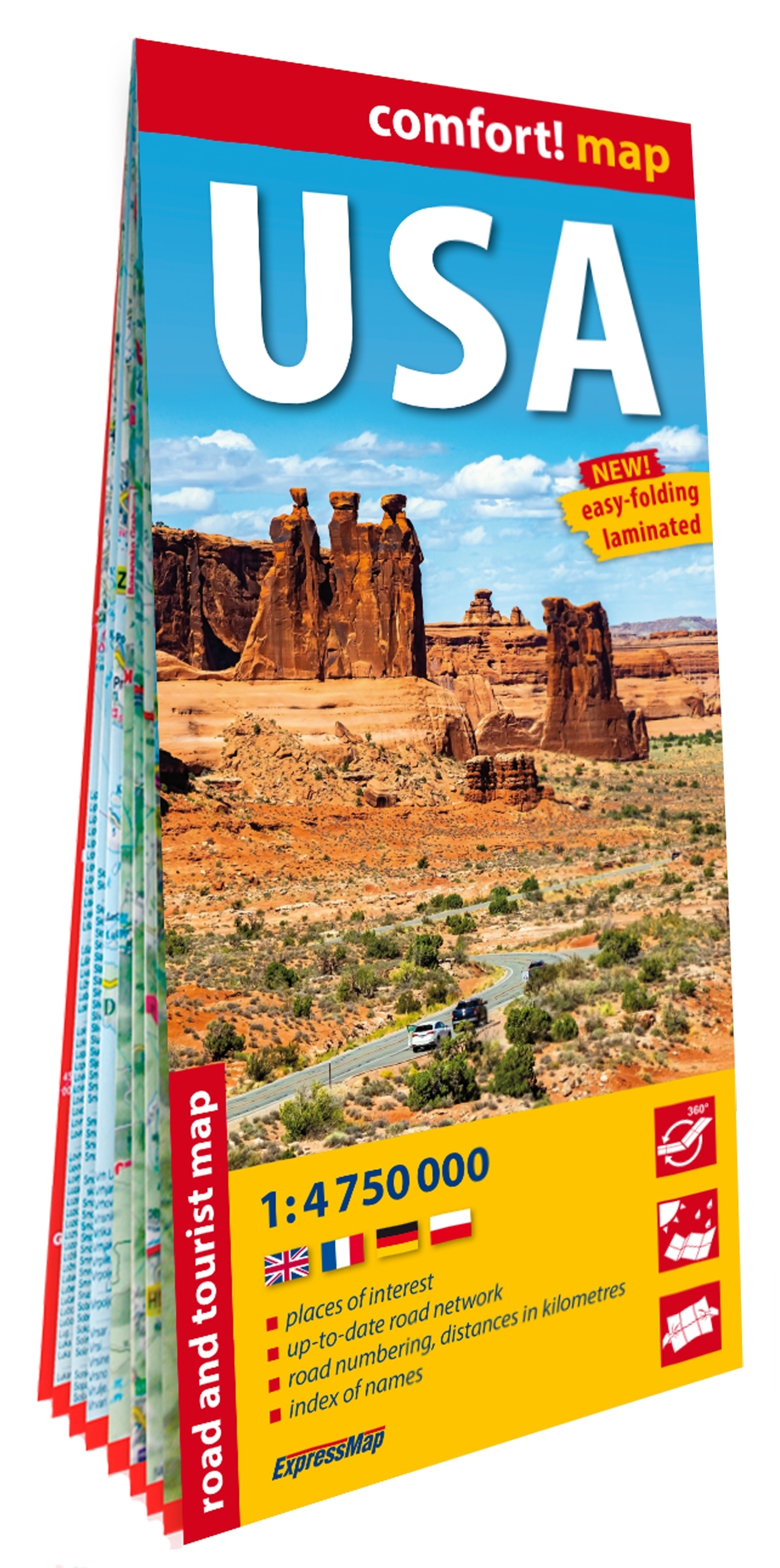 Gratte-ciel de New-York, casinos de Las Vegas, geysers du parc national de Yellowstone, sommets majestueux de la Sierra Nevada. Attractions de Disneyland, virée sur la célèbre Route 66, randonnée dans le spectaculaire Grand Canyon et détente sur les plages de Santa Barbara. Les États-Unis regorgent d'attractions touristiques. Cette carte routière et touristique laminée recto-verso et facile à plier aide à les repérer.La carte comprend notamment :- les attractions touristiques ;- le relief ;- l'état actuel des routes ;- la catégorisation détaillée et la numérotation des toutes ;- la carte de l'Alaska à l'échelle 1 : 9 500 000, la carte des îles hawaïennes à l'échelle 1 : 4 750 000 ;- les distances routières en kilomètres ;- un répertoire des noms.