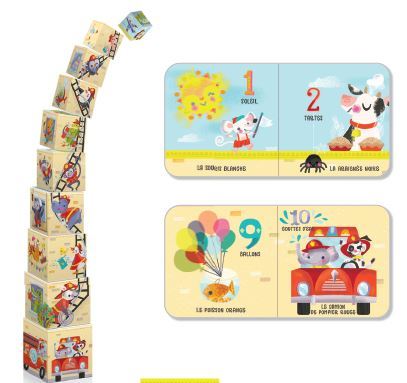 Apprendre de nouveaux mots, des couleurs, des nombres, des formes et des animaux. Stimuler le développement sensoriel et la motricité fine.Construire une tour de 88 cm de haut avec 10 cubes et recréer une scène bucolique avec la face supérieure des cubes.Cette livres accompagnés de cubes apprendront aux enfants à compter jusqu'à dix tout en les familiarisant avec les couleurs, les formes et les animaux. Les dix cubes permettent un apprentissage à la fois ludique et interactif et contribuent au développement des capacités motrices des tout-petits