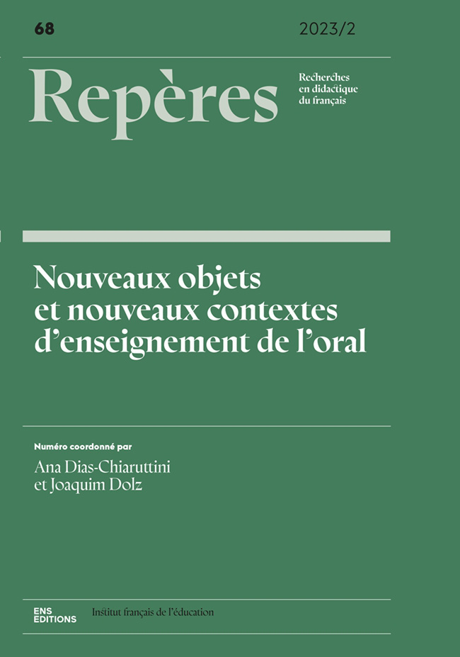 Où en est-on de l'enseignement de l'oral? Ce numéro de Repères consacré aux nouveaux objets et aux nouveaux contextes d’enseignement de l’oral se propose de faire le point sur les avancées concernant cet enseignement. À travers deux études comparatives entre pays francophones d’une part et des pays lusophones d’autre part une rétrospective de cet enseignement est proposée pour éclairer son évolution autant dans le champ de la recherche, que celui des pratiques enseignantes, mais aussi à travers les textes officiels. Les nouveaux objets se formalisent à travers des recherches design ou encore des recherches collaboratives qui développent des leviers de transformation des pratiques en impliquant les enseignants dans le travail d’élaboration des séquences ou des dispositifs. Enfin, les recherches sur l’analyse des pratiques enseignantes et celle des outils didactiques viennent éclairer comme la lecture à haute voix se met en œuvre dans le premier degré, en formation des enseignants et en lycée professionnel.