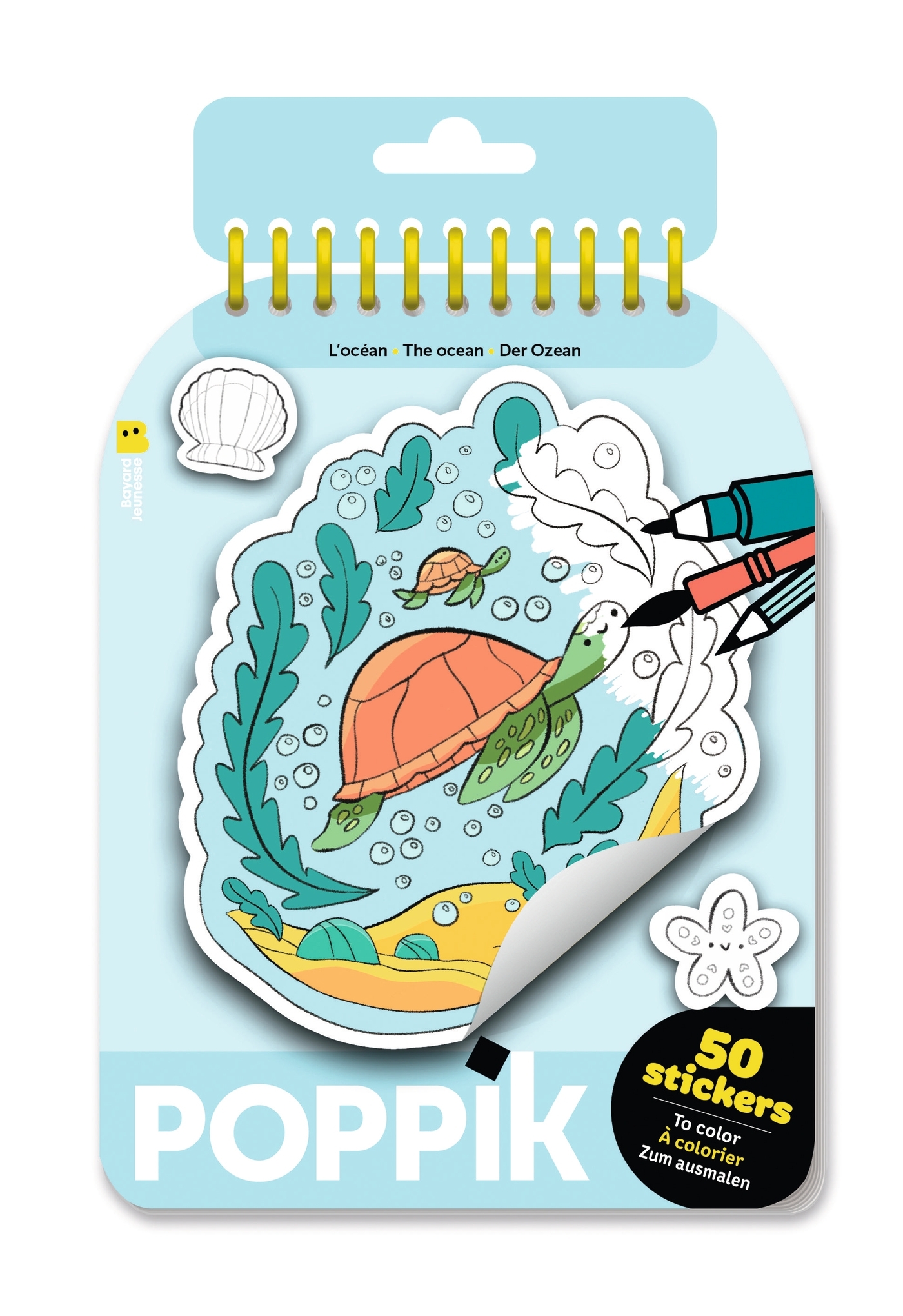 Colorie, personnalise, décore !Découvre la collection Sticker notebooks ! De petits carnets à spirale contenant 50 autocollants à colorier. 50 autocollants en noir et blanc, sur le thème des océans.Tortue, requins, crabes, coquillages, hippocampes... portés par le trait ultra mignon de Julie Gore !