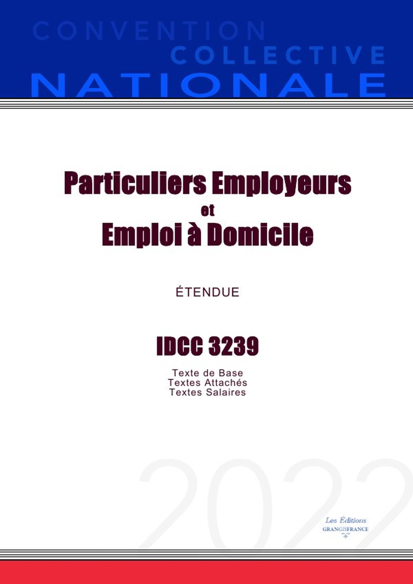 Dans cette nouvelle édition rédigée par les experts Grangisfrance vous trouverez le texte intégral (Texte de Base, Textes Attachés et Textes/Grille des Salaires).Livre broché grand format 21 x 29.7cm.Version consolidé au 10 février 2022.Detail du contenu de la convention collective:Convention collective nationale des particuliers employeurs et de l'emploi à domicile du 15 mars 2021 - Étendue par arrêté du 6 octobre 2021 JORF 16 octobre 2021.Convention collective nationale IDCC 3239.Particuliers employeurs et emploi à domicile.
