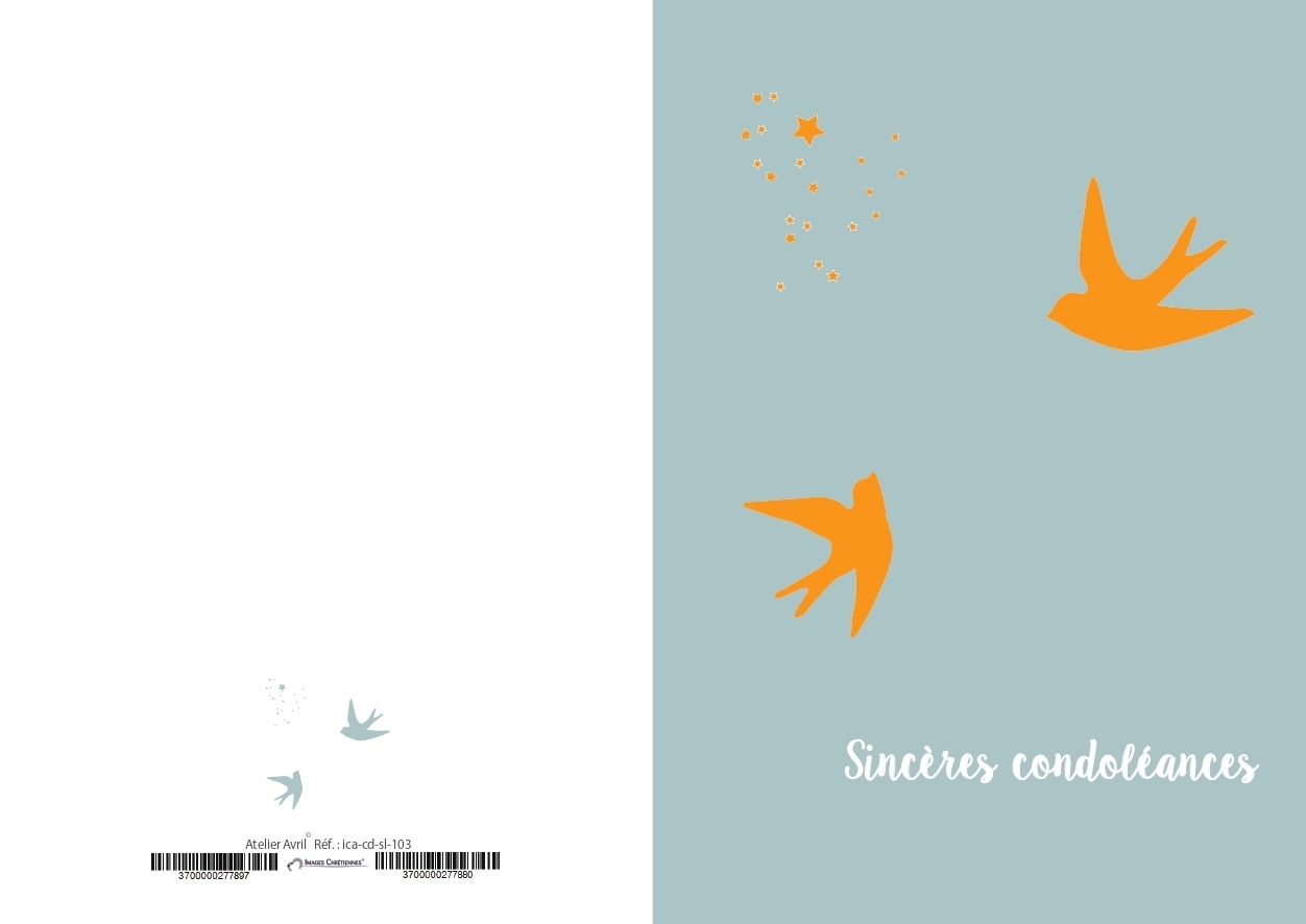 Carte de Condoléances sobre évocant l'envol de l'ame vers le Ciel. Carte double avec enveloppe. Le motif des colombes et des étoiles est recouvert d'un vernis selectif pour donner du relief. Cela rend le motif plus concret et offre une expérience de consistance au toucher.