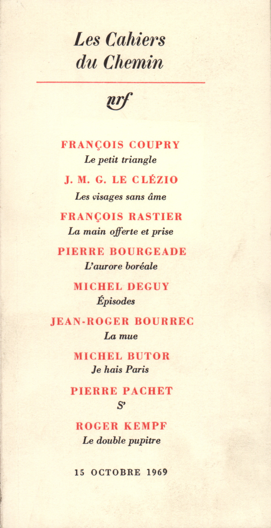 François Coupry, Le petit triangleJ. M. G. Le Clézio, Les visages sans âmeFrançois Rastier, La main offerte et prisePierre Bourgeade, L'aurore boréaleMichel Deguy, ÉpisodesJean-Roger Bourrec, La mueMichel Butor, Je hais ParisPierre Pachet, S'Roger Kempf, Le double pupitre
