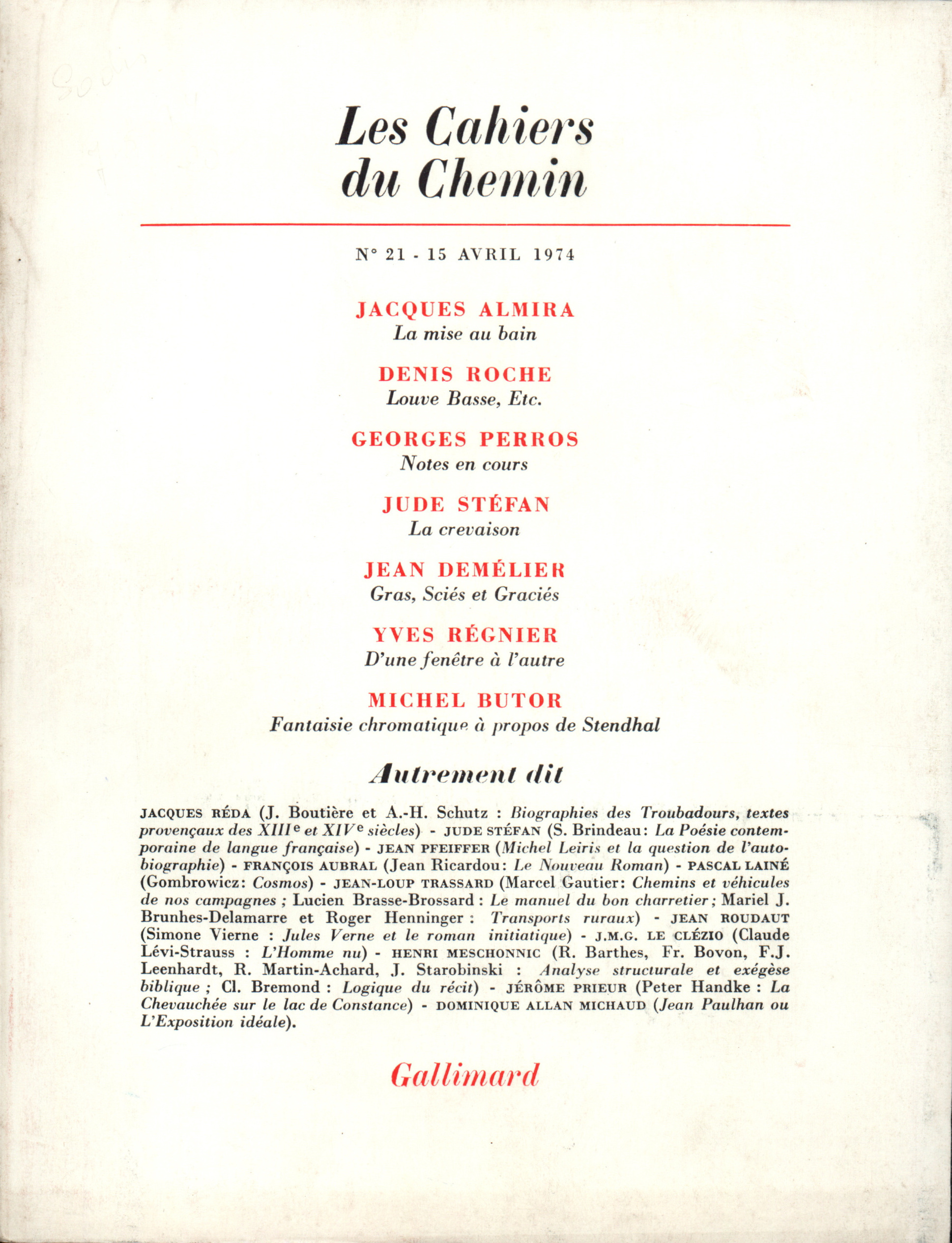 Jacques Almira, La mise au bain Denis Roche, Louve basse, etc. Georges Perros, Notes en cours Jude Stéfan, La crevaison Jean Demélier, Gras, sciés et graciés Yves Régnier, D'une fenêtre à l'autre Michel Butor, Fantaisie chromatique à propos de Stendhal Jacques Réda, J. Boutière et A.-H. Schutz, Biographies des Troubadours, textes provençaux des XIIIe et XVe siècles Jude Stéfan, S. Brindeau, La poésie contemporaine de langue française Jean Pfeiffer, Michel Leiris et la question de l'autobiographie Francois Aubral, Jean Ricardou, Le Nouveau Roman Pascal Lainé, Gombrowicz, Cosmos Jean-Loup Trassard, Marcel Gautier, Chemins et véhicules de nos campagnes ; Lucien Brasse-Brossard, Le manuel du bon charretier ; Mariel J.Brunhes-Delamarre et Roger Henninger, Transports ruraux Jean Roudaut, Simone Vierne, Jules Verne et le roman initiatique J. M. G. Le Clézio, Claude Lévi-Strauss, L'homme nu Henri Meschonnic, R. Barthes, Fr. Bovon, F.J. Leenhardt, R. Martin-Achard, J. Starobinski, Analyse structurale et exégèse biblique ; Cl. Bremond, Logique du récit Jérôme Prieur, Peter Handke, La chevauchée sur le lac de Constance Dominique Allan Michaud, Jean Paulhan ou L'exposition idéale