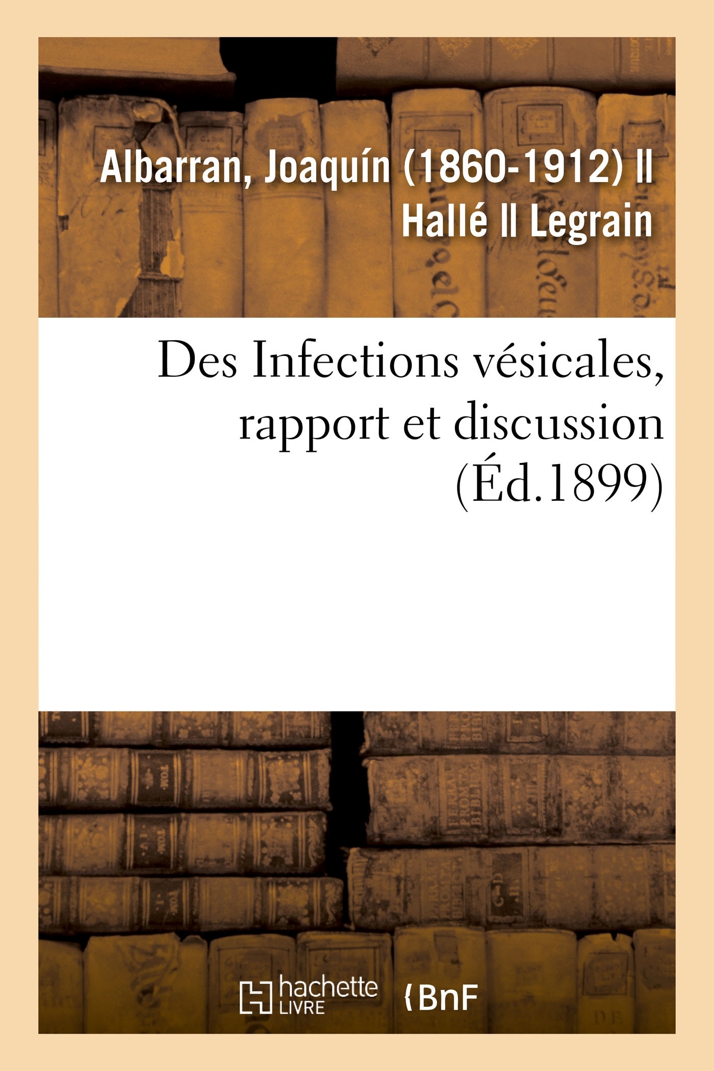 Des Infections vésicales. Rapport (par MM. Albarran, Hallé et Legrain) et discussionDate de l'édition originale : 1899Le présent ouvrage s'inscrit dans une politique de conservation patrimoniale des ouvrages de la littérature Française mise en place avec la BNF. HACHETTE LIVRE et la BNF proposent ainsi un catalogue de titres indisponibles, la BNF ayant numérisé ces oeuvres et HACHETTE LIVRE les imprimant à la demande. Certains de ces ouvrages reflètent des courants de pensée caractéristiques de leur époque, mais qui seraient aujourd'hui jugés condamnables. Ils n'en appartiennent pas moins à l'histoire des idées en France et sont susceptibles de présenter un intérêt scientifique ou historique. Le sens de notre démarche éditoriale consiste ainsi à permettre l'accès à ces oeuvres sans pour autant que nous en cautionnions en aucune façon le contenu. Pour plus d'informations, rendez-vous sur www.hachettebnf.fr