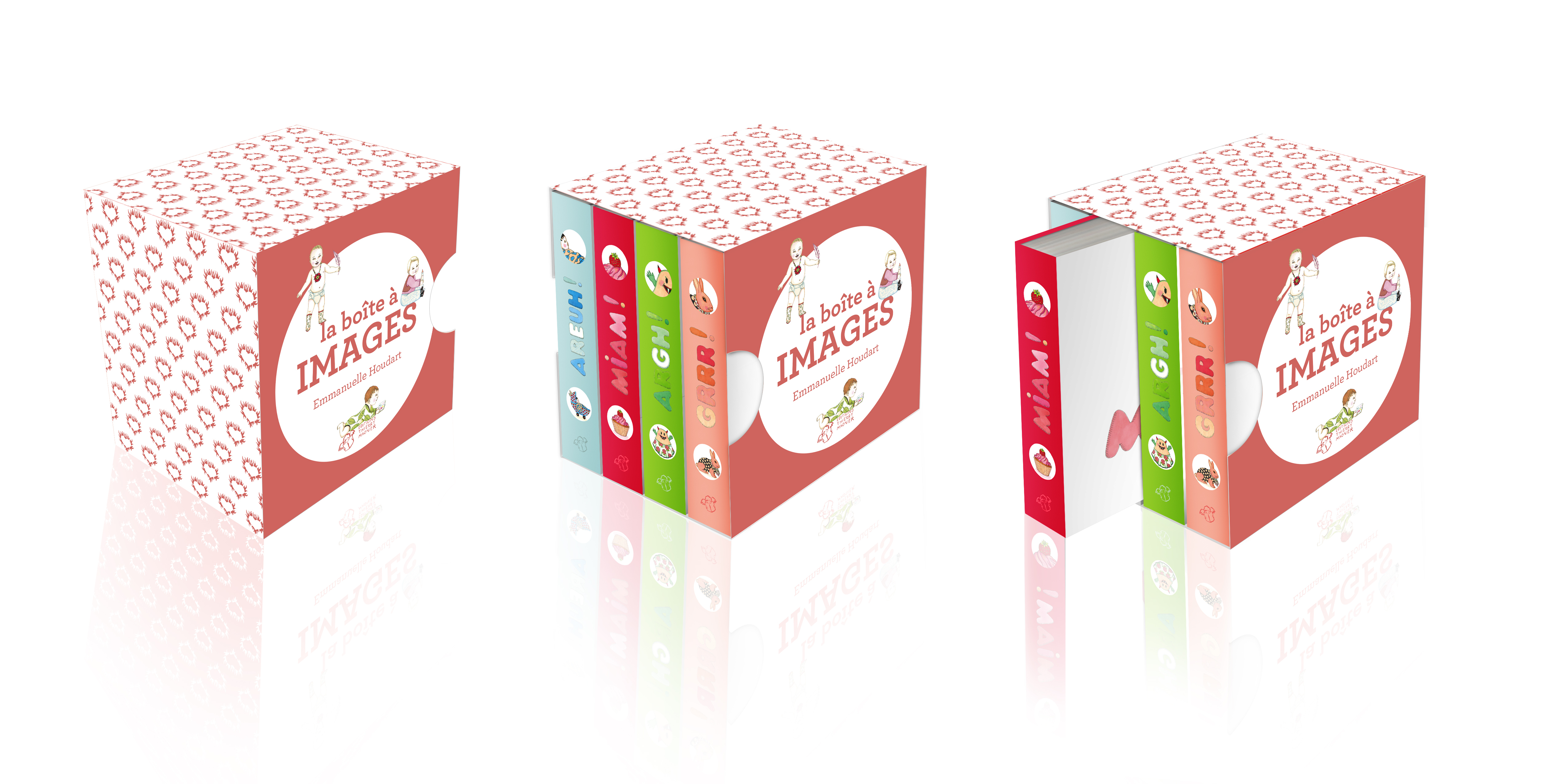Un coffret qui contient 4 minis imagiers autour de thèmes récurrents de la vie des tout-petits : la nourriture (« miam !»), les animaux (« grrr !»), le quotidien (« areuh !») et la peur (« argh !»).