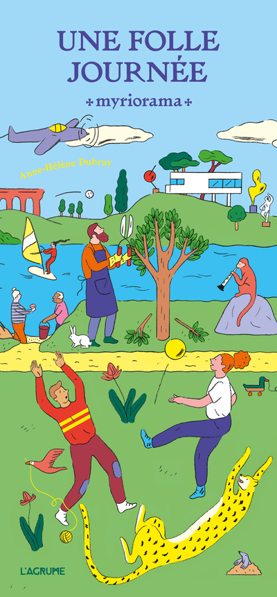 Un étonnant livre-boîte : des images à composer comme des puzzles et de multiples histoires à inventer. Le myriorama est un jeu pour enfants inventé au 19e siècle et consistant à construire une multitude de paysages possibles grâce à des cartes pouvant toutes s'assembler les unes avec les autres. Anne-Hélène Dubray reprend ce concept de jeu narratif pour en faire un livre-objet littéraire avec Une folle journée . Dans un coffret, un livre accordéon de 22 pages recto-verso propose deux histoires différentes d'une folle journée. Après lecture de ces histoires, l'enfant peut s'amuser avec les 14 cartes jointes dans le coffret, qui permettent de composer 87 178 291 200 possibilités de paysages, peuplés de toutes sortes d'animaux, d'engins et de nombreux personnages en action : une famille qui pique-nique, des enfants qui jouent dans une fontaine, un joueur de golf, une femme en monocycle... et en imaginer les histoires.