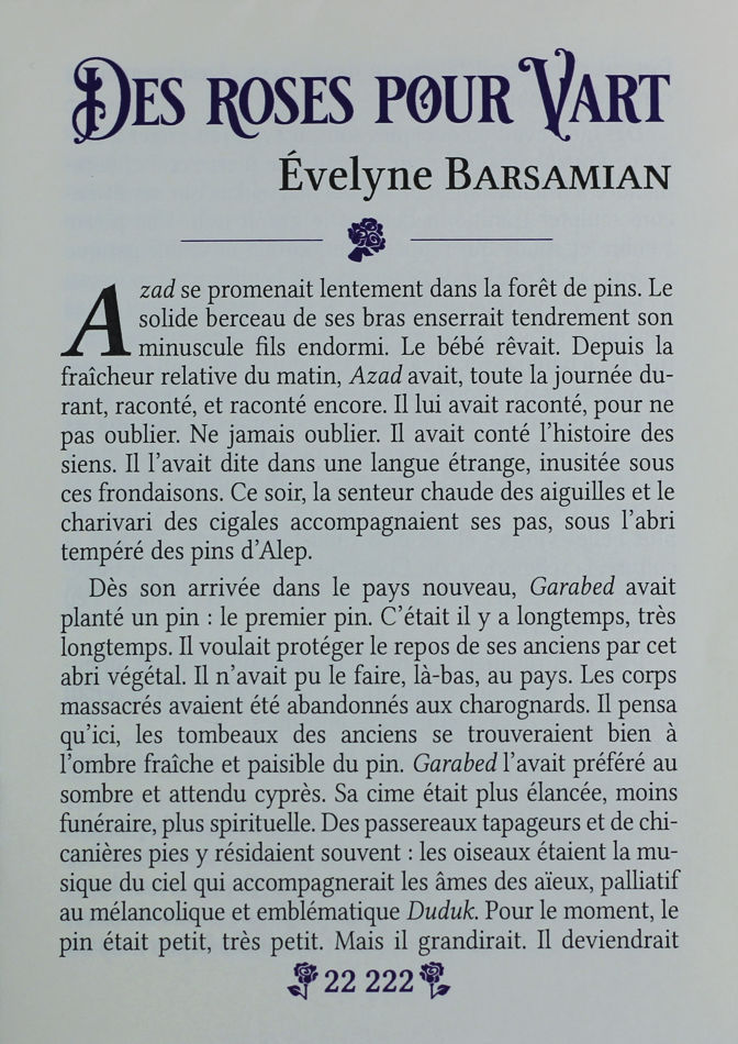 D’après Danton on ne peut emporter sa patrie à la semelle de ses souliers, il est possible toutefois de prendre avec soi quelques graines et une poignée de terre pour ne pas oublier•••Évelyne Barsamian a été enseignante en collège « sensible » puis a poursuivi des recherches en pédagogie et des études hors sentiers jusqu'à un doctorat en psychologie clinique orientation psychanalytique ainsi qu’un master en lettres modernes et un en philosophie. Elle a fait des enquêtes généalogiques sur une histoire familiale non transmise qui l’ont menée à l'écriture de Des roses pour Vart, mélange de drames familiaux, de pièces d'histoire et de témoignages. Elle a dédié son mémoire de master sur le génocide arménien à ses grands-parents et aux leurs, cette histoire s'essaie à retisser leur humanité et leur arménité.