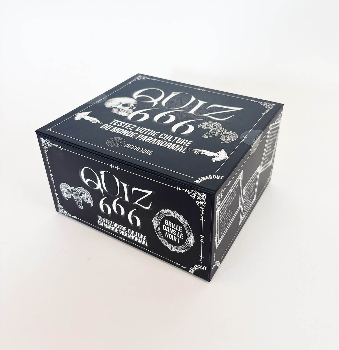 Répondez correctement à de mystérieuses questions et obtenez le plus de points possibles pour être élu "bête de l'apocalypse". Mais attention, de multiples malédictions vous guettent...240 cartes et 1 livret des règles du jeu, et une boîte qui brille dans le noir !6 catégories de questions : spectres & démons, cryptozoologie & créatures légendaires, lieux étranges hantés & maudits, phénomènes psychiques et divination, culture pop, occultisme et paganisme.Des exemples de questions :- Comment appelle-t-on une réunion de sorcières qui pratiquent ensemble la magie ? Un cercle, un coven, une assemblée ou un conclave ?- Quel pseudonyme utilise Gérard Encausse, occultiste français du début du XX ème siècle ? Papus, Aleister Crowley, Eliphas Lévi ou Manly P. Hall ?- Quel film a popularisé l'idée que la morsue d'un loup-garou transmet la malédiction ? Dracula, Werewolves, Le Loup-Garou de Londres ou teen Wolf ?