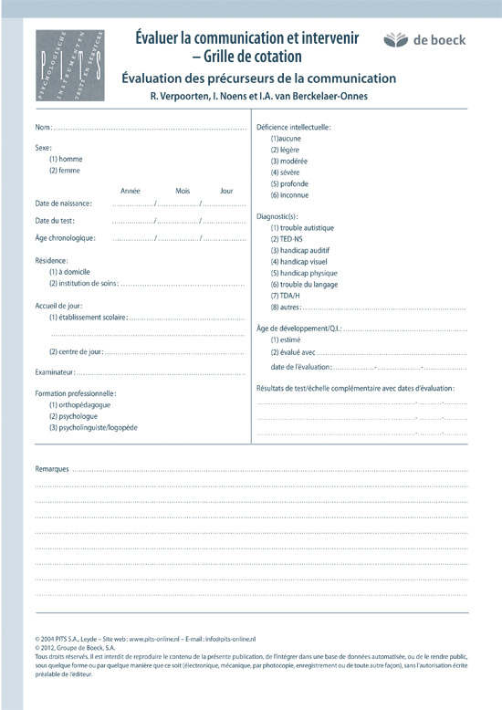 Ce test évalue le niveau de présentation et de représentation des personnes avec autisme ou présentant une déficience intellectuelle et des troubles de la communication afin de mettre au point une communication alternative ou augmentative individualisée.Évaluer la communication et intervenir est un outil développé pour évaluer le niveau de communication réceptive auquel les personnes avec autisme ont accès. Il permet à l'évaluateur de disposer d'une information plus précise quant à leurs compétences de représentation.Dans une première partie, l'ouvrage fournit un cadre référentiel théorique ainsi que les propriétés psychométriques de l'outil. Il décrit ensuite l'administration du test, les scores et l'interprétation des résultats. L'ensemble permet de développer une évaluation clinique précise, débouchant sur la mise au point d'un programme de communication augmentative ou alternative, qui pourra prendre une forme tri-dimensionnelle (objets) ou bi-dimensionnelle (photographie, dessins, pictogrammes, etc.).Le test s'adresse aux personnes (enfants, adolescents, adultes) dont le niveau de développement psychomoteur se situe entre 12 et 60 mois, mais également à celles présentant une déficience intellectuelleet des troubles de la communication. En ce sens, il constitue un complément particulièrement intéressant au PEP-3.L'ouvrage intéressera les psychologues et les psycho-linguistes tout autant que les logopèdes (orthophonistes).